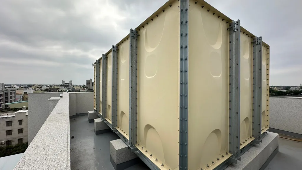 匯寶「新新子境」比照豪宅大樓與台積電等科技大廠,採用日本原裝進口組合式儲水系統。業者提供