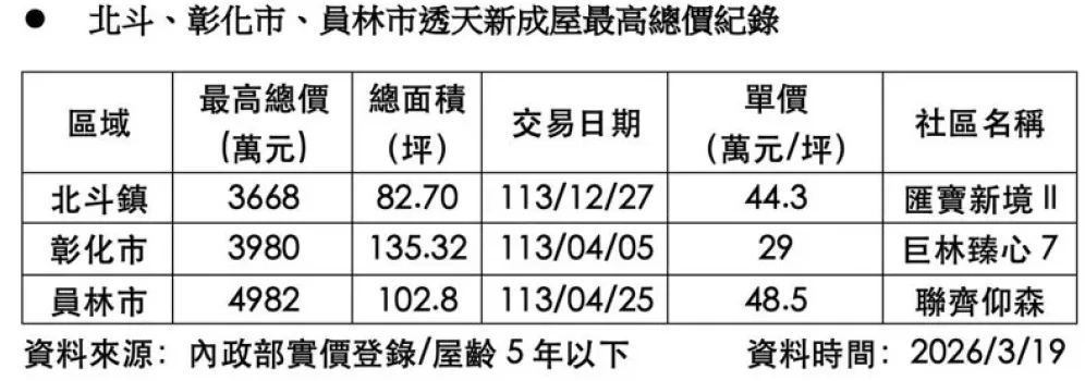 北斗、彰化市、員林市透天新成屋最高總價紀錄。資料來源:內政部實價登錄